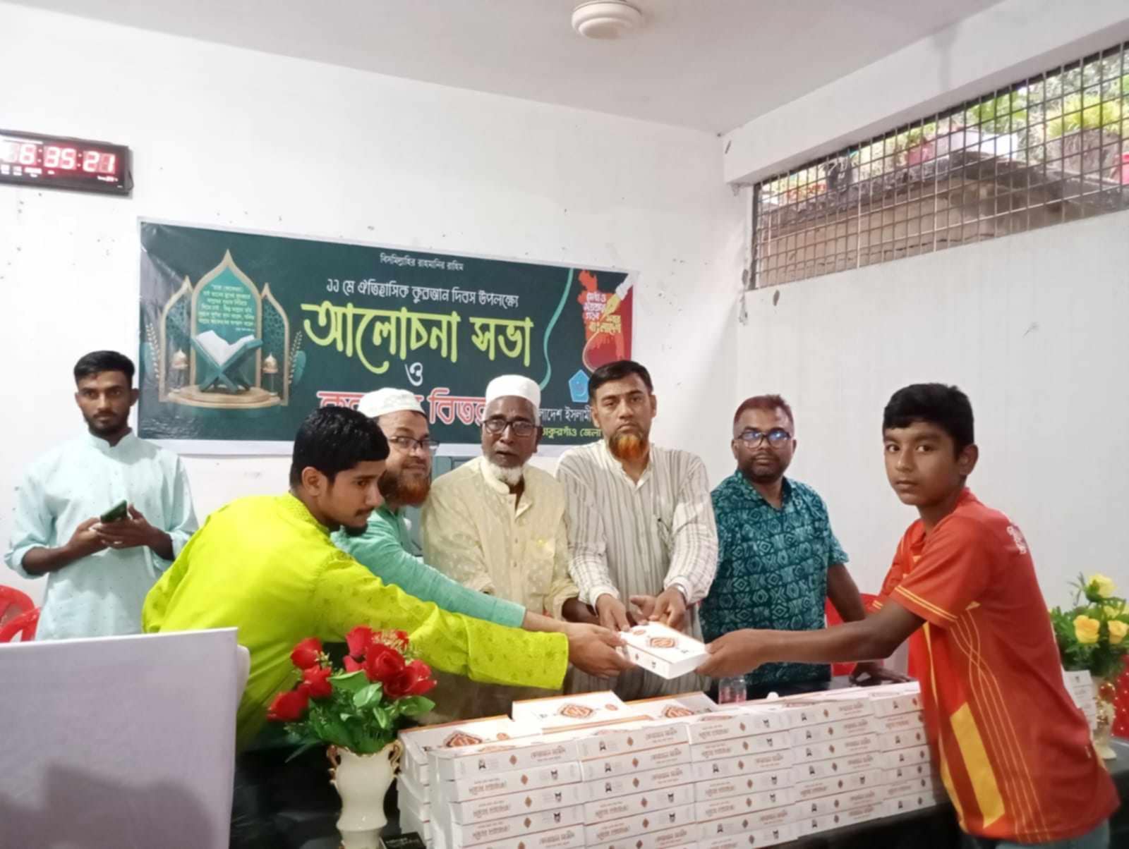 বিশেষ অতিথি হিসেবে উপস্থিত ছিলেন, জামায়াতের পৌর আমীর আব্দুল মতিন বিশ্বাস,জামায়াতের শ্রমিক কল্যাণ ফেডারেশনের সভাপতি মাওলানা মতিউর রহমান, আদর্শ শিক্ষক সমিতির সাধারণ সম্পাদক মোশারফ হোসেন। এছাড়াও অনুষ্ঠানে আল-হিকমাহ্ এনলাইটেন্ড স্কুলের পরিচালক,মিজানুর রহমান,ছাত্রশিবিরের উপজেলা সভাপতি শামীম ইসলাম,  সেক্রেটারি বদরুল ইসলাম,প্রভাষক শাহীন আলম প্রমুখ। আলোচনা শেষে অতিথিরা ৯০ জন মেধাবী শিক্ষার্থীর মাঝে একটি করে পবিত্র কুরআন শরীফ বিতরণ করেন। প্রসঙ্গত: ১৯৮৫ সালের ১০ এপ্রিল ভারতে পবিত্র কুরআনকে বাজেয়াপ্ত করার জন্য রিট পিটিশন দায়ের করা হয়। ফলে তীব্র প্রতিবাদে ফেটে পড়ে সারাবিশ্বের তৌহিদী জনতা। চাঁপাইনবাবগঞ্জে ১১মে প্রতিবাদ মিছিলে পুলিশ গুলী ছুড়লে ৮ জন শাহাদাৎ বরণ করেন। সেই থেকে কুরআনের জন্য জীবন দেওয়ার এই দিনটিকে ইসলামী ছাত্রশিবির কুরআন দিবস হিসেবে পালন হয়ে  আসছে।