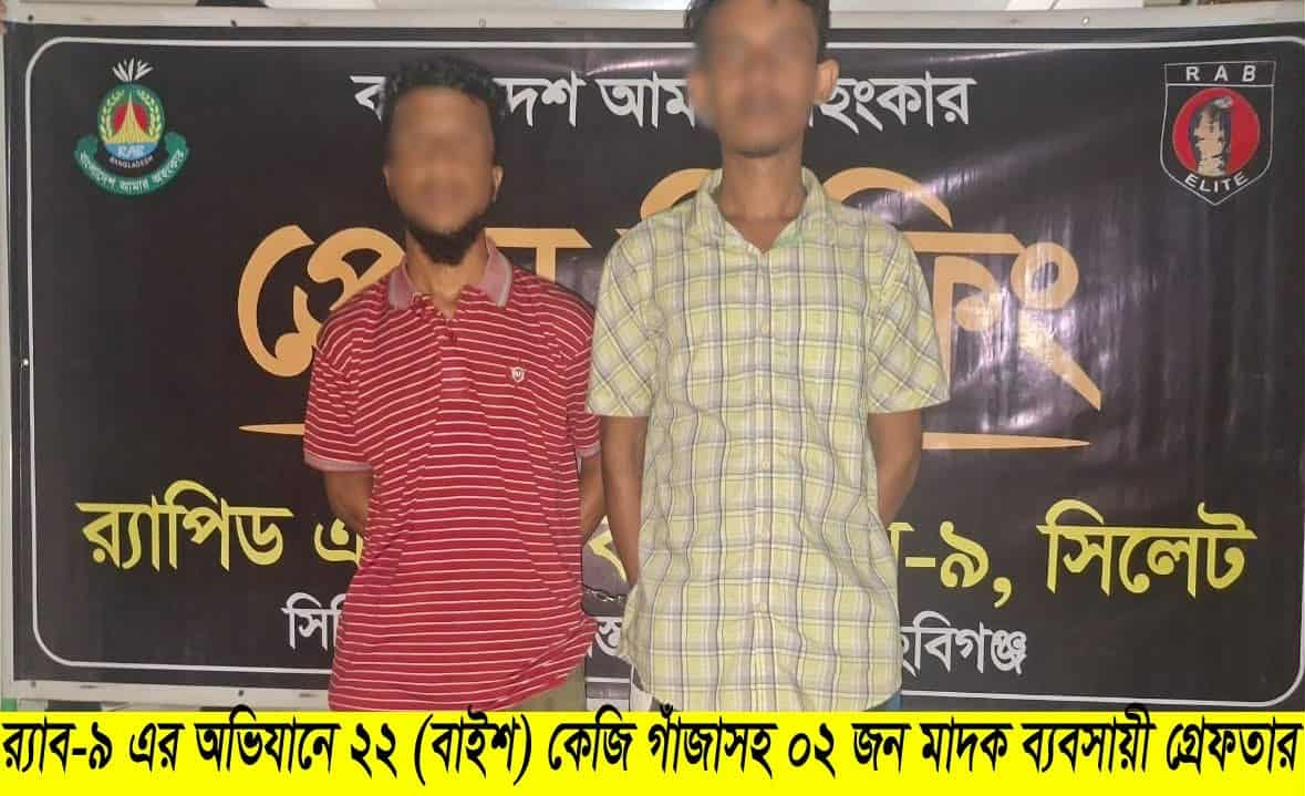 র্যাব-৯ সিলেট মিডিয়া অফিসের অতিরিক্ত পুলিশ সুপার কে. এম. শহিদুল ইসলাম সোহাগ স্বাক্ষরিত সংবাদ বিজ্ঞপ্তিতে জানানো হয়, গোপন সংবাদের ভিত্তিতে র্যাব-৯ এর সিপিসি-৩, শায়েস্তাগঞ্জ ক্যাম্পের একটি দল অভিযান চালায়। এসময় ১৫টি পলিথিনে মোড়ানো মোট ২২ কেজি গাঁজাসহ দুইজনকে আটক করা হয়।